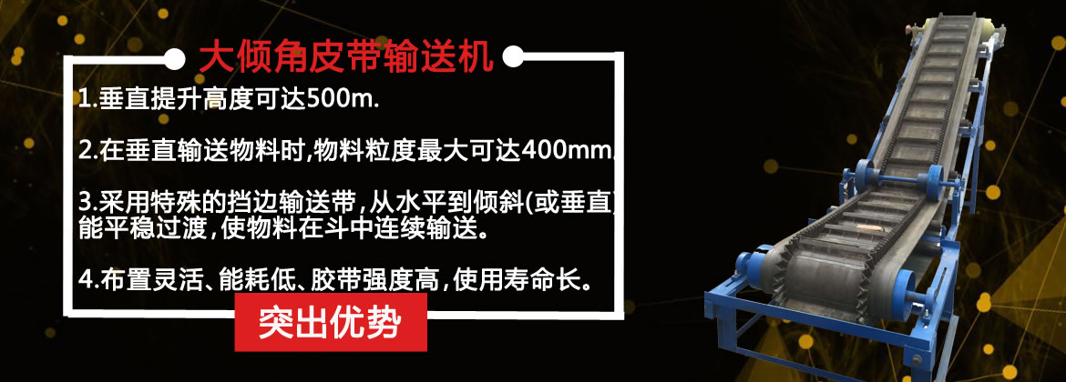 1.大傾角皮帶輸送機為一般用途的散狀物料連續(xù)輸送設(shè)備,但采用的是具有波狀擋邊和橫隔板的輸送帶。因此,特別適用于大傾角及垂直90°輸送。