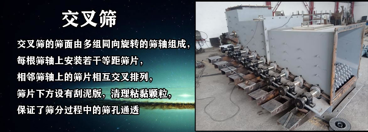 【產(chǎn)品介紹】:交叉篩的篩面由多組同向旋轉(zhuǎn)的篩軸組成,每根篩軸上安裝若干等距篩片,相鄰篩軸上的篩片相互交叉排列,篩片下方設(shè)有刮泥版,清理粘黏顆粒,保證了篩分過程中的篩孔通透